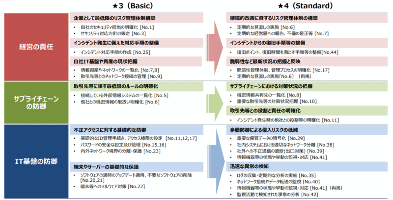 この制度が運用されると、これまで大企業は、取引先の中小企業で事故が起きても「対策状況は確認していたが、防げなかった」と言えましたが、今後は「★3以上の企業との取引に切り替えよう」という動きが加速します。現在でも多くの大企業が「取引基本契約書」でセキュリティ対策を求めていますが、その具体的な基準が曖昧でした。「サプライチェーン強化に向けたセキュリティ対策評価制度」に沿ってマネジメントシステムの構築とネットワーク機器、システム、利用者端末(PC、スマホ)の対策を実施していく必要があります。